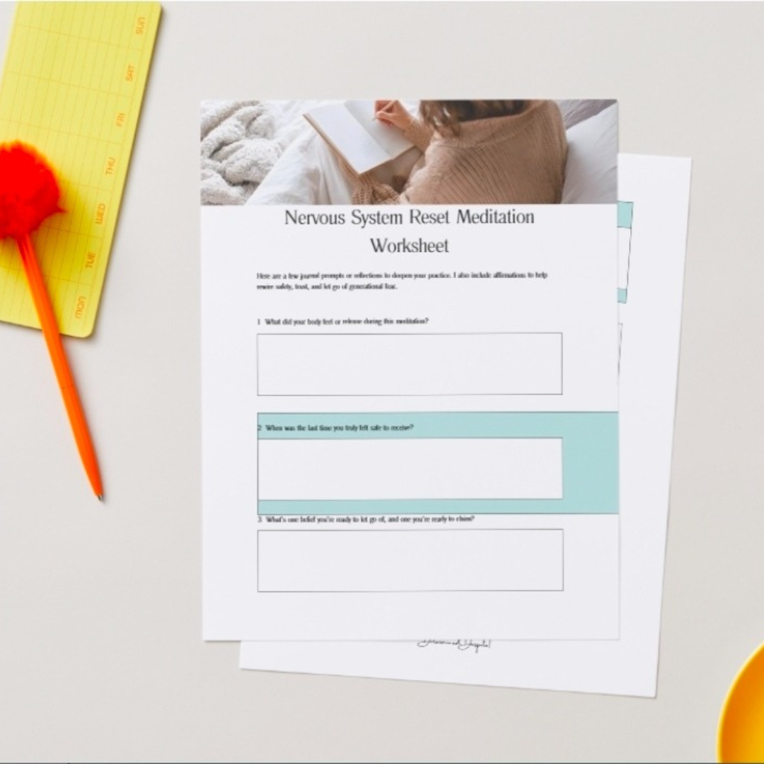 This Nervous System Reset Meditation Worksheet was created to support you in calming your nervous system, rewiring safety and trust, and releasing fear patterns—especially those rooted in stress, conditioning, or generational trauma.